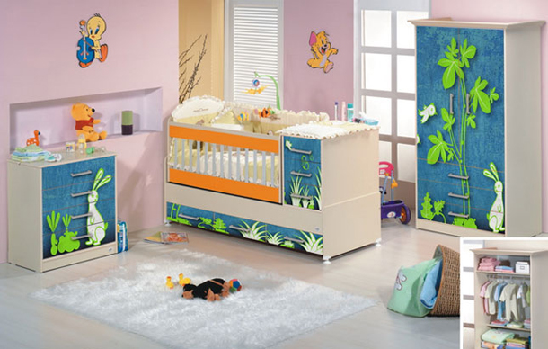 Bebek odalarında dolapların, yatak başlarına, konsola, ve yatak bazasına uygulanan resimler ile çocuğunuzun istediği gibi bir oda tasarlayabilirsiniz.